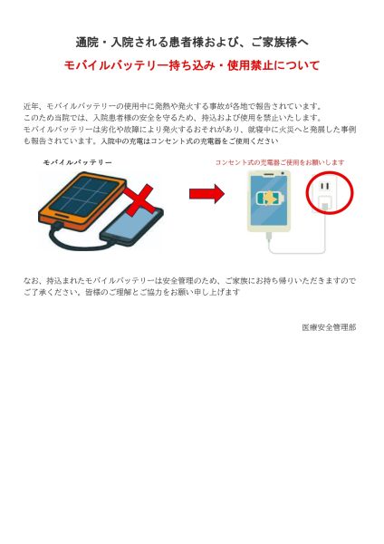 近年、モバイルバッテリーの使用中に発熱や発火する事故が各地で報告されています。このため当院では、入院患者様の安全を守るため、持込および使用を禁止いたします。モバイルバッテリーは劣化や故障により発火するおそれがあり、就寝中に火災へと発展した事例も報告されています。入院中の充電はコンセント式の充電器をご使用ください